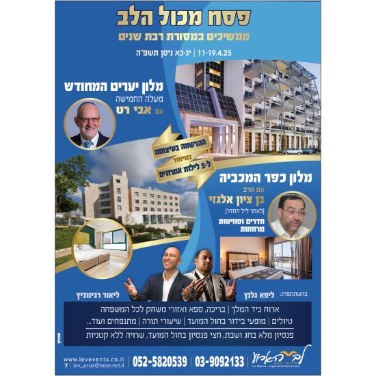 פסח ב"לב הארוע" הוא כמו רכבת הרים – ארוע רודף ארוע: שיעורים מגוונים, סיורים וטיולים, הפעלות לילדים, הצגות וסרטים, הרצאות ושיעורים,